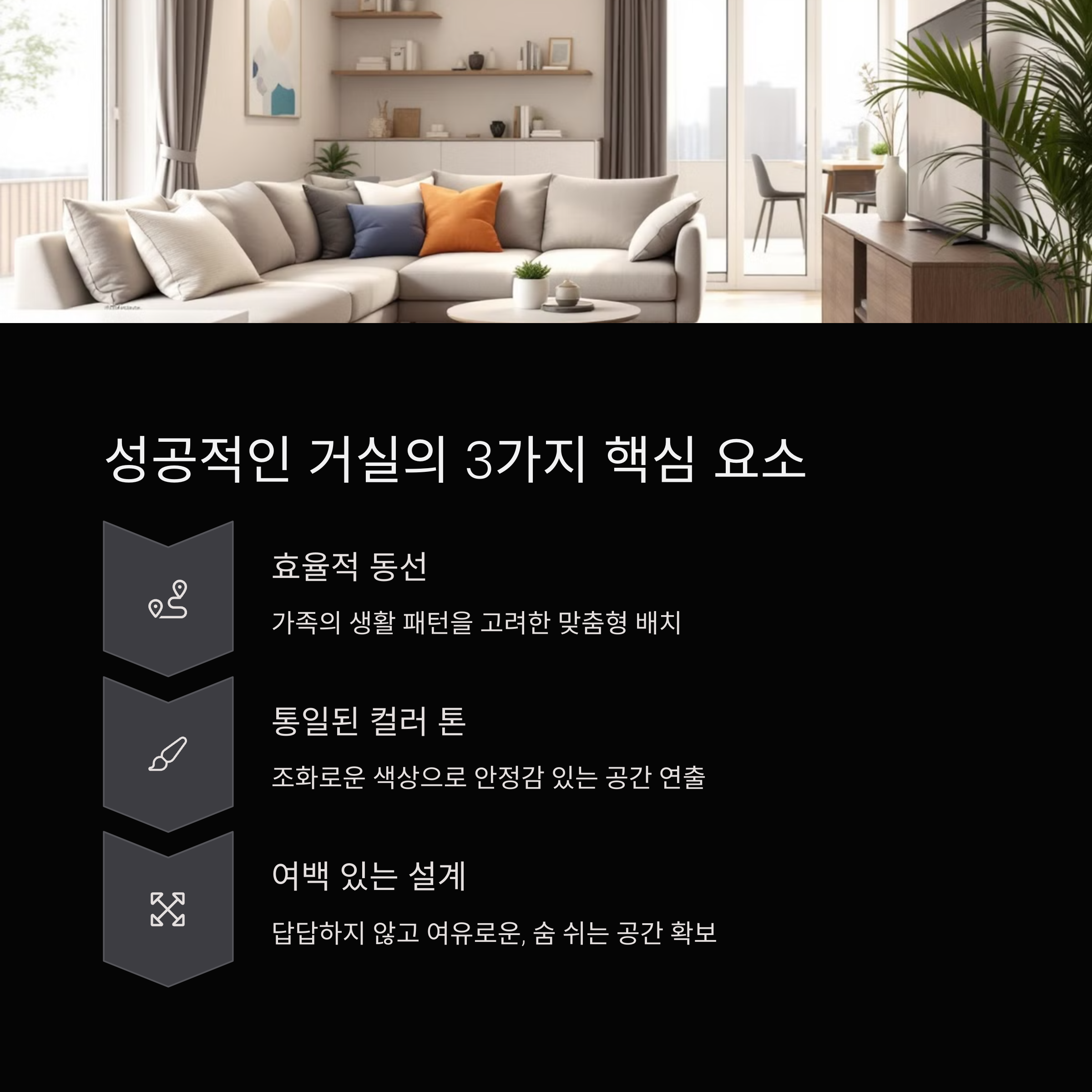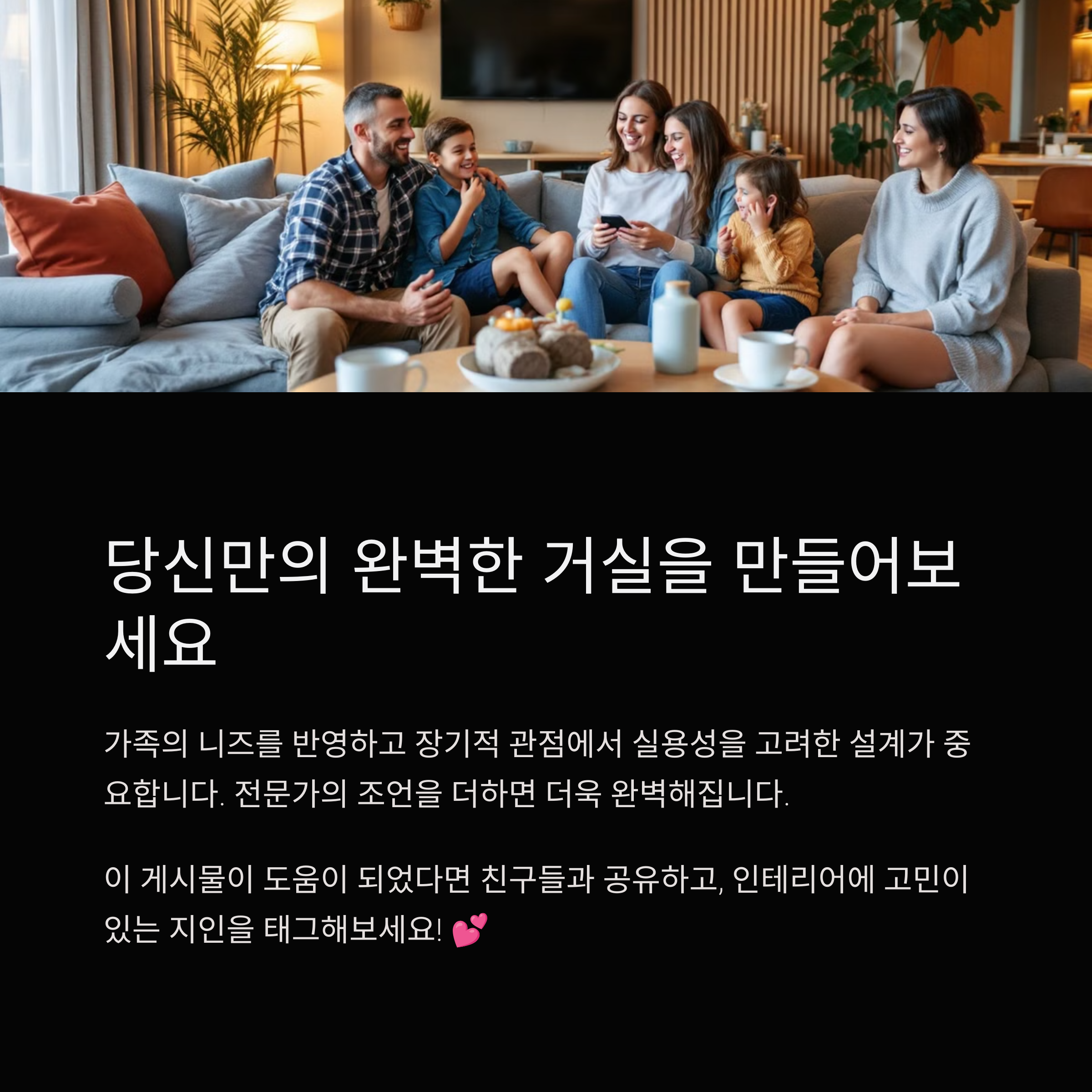 스타일 욕심만 앞서면 전체 조화가 무너지기 쉽습니다. 컬러 톤 통일, 수납 계획, 활동 동선 등을 종합적으로 고려해 설계해야 거실이 실제로 쾌적하고 오래 만족스럽습니다. 트렌드를 무조건 따라가기보다 우리 가족의 생활 방식에 최적화된 구성이 핵심이에요.