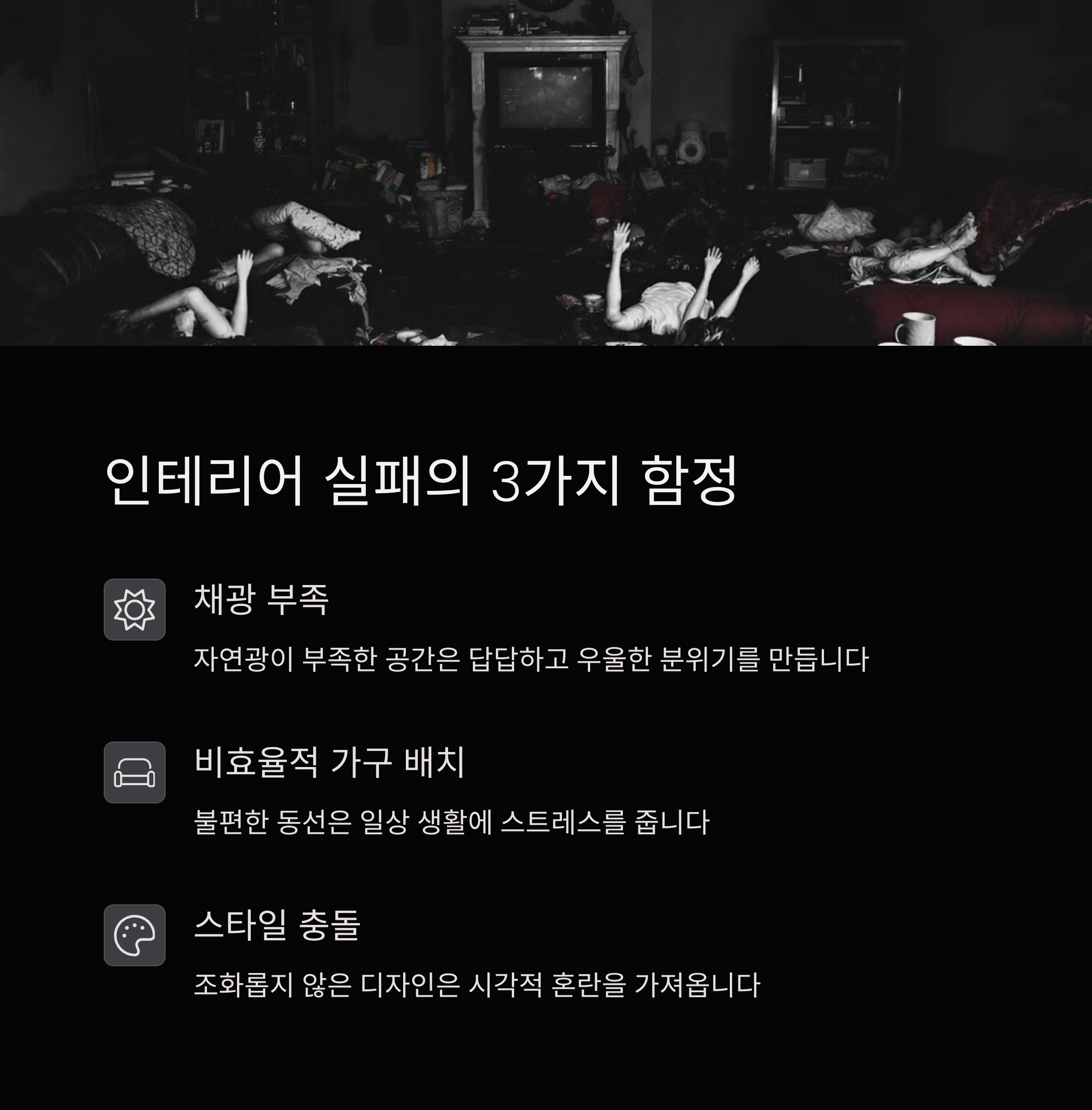 | 조명 부족, 가구 과다, 스타일 충돌 | 조도계획 + 여백 있는 배치 + 컬러 통일 | 생활 패턴 중심 설계, 가변형 가구 활용 |