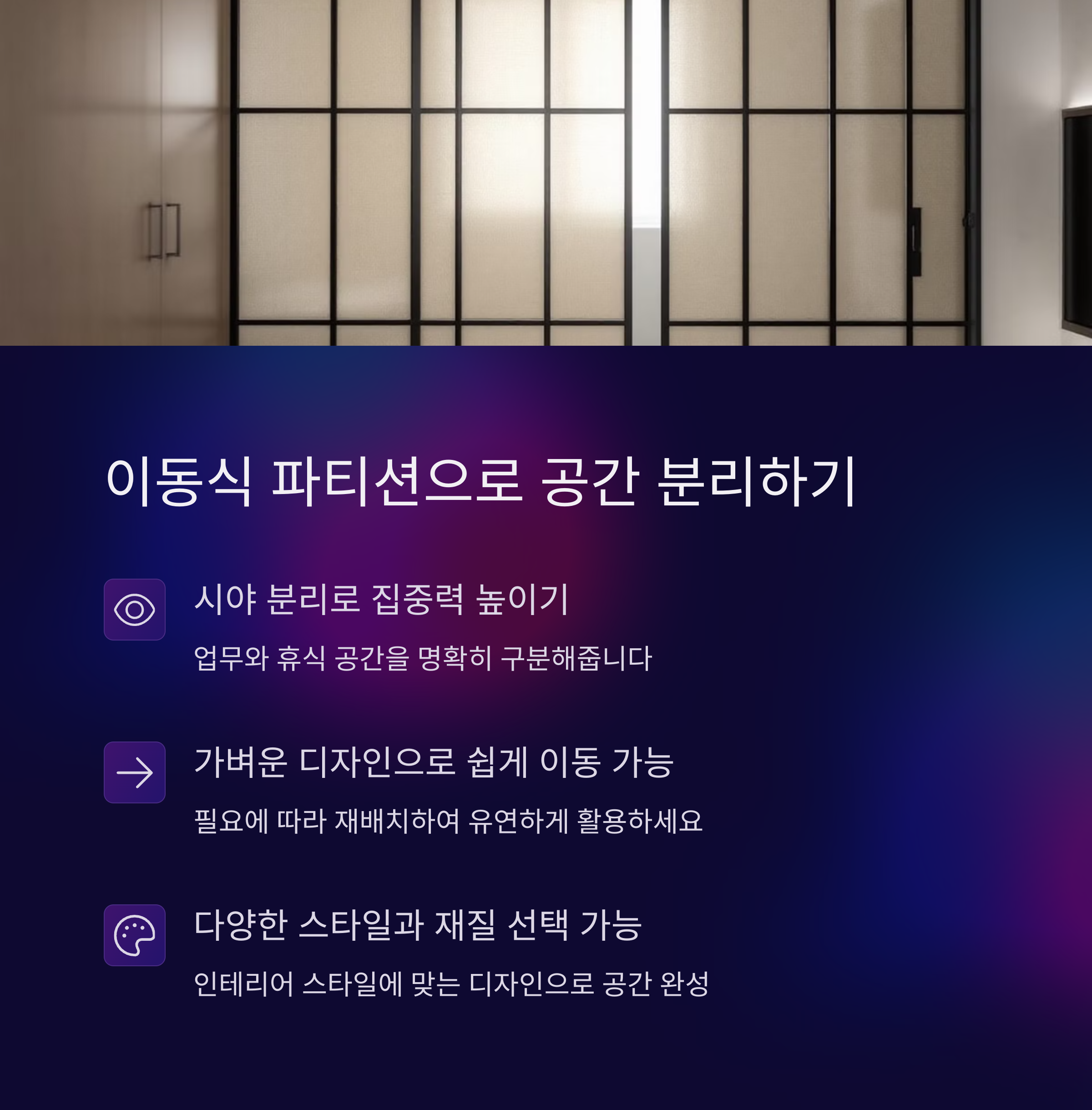 | 파티션 추천 | 가볍고 이동 가능한 파티션이 활용도 높아요 |