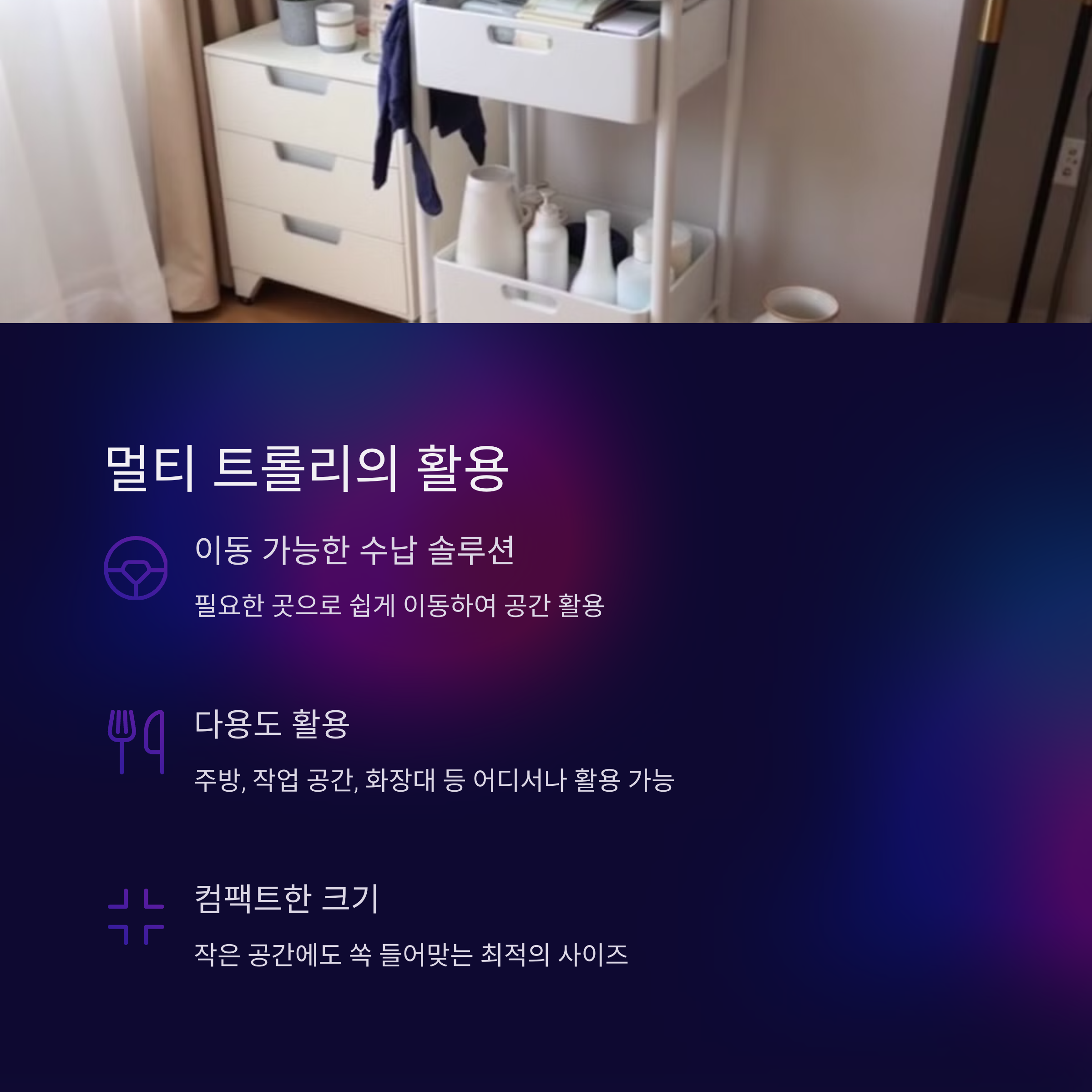 | 원룸 파티션 | 수납형 책장 | 이동식 트롤리 |