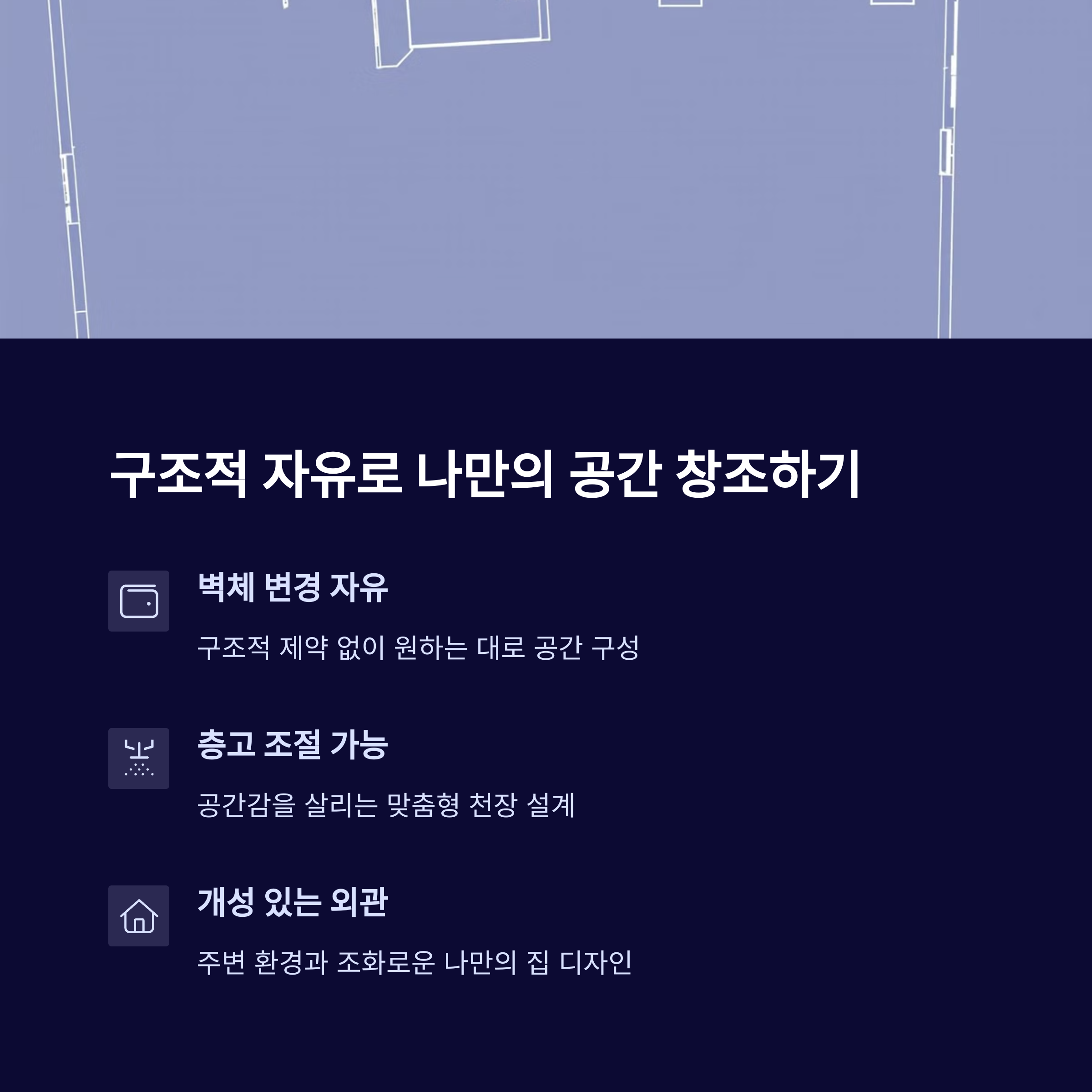 | 개별 취향 반영한 공간 구성 용이 | 공간별 역할 명확히 나누고 기능성 고려 | 평면 구조인 아파트보다 계획 요소 많음 |