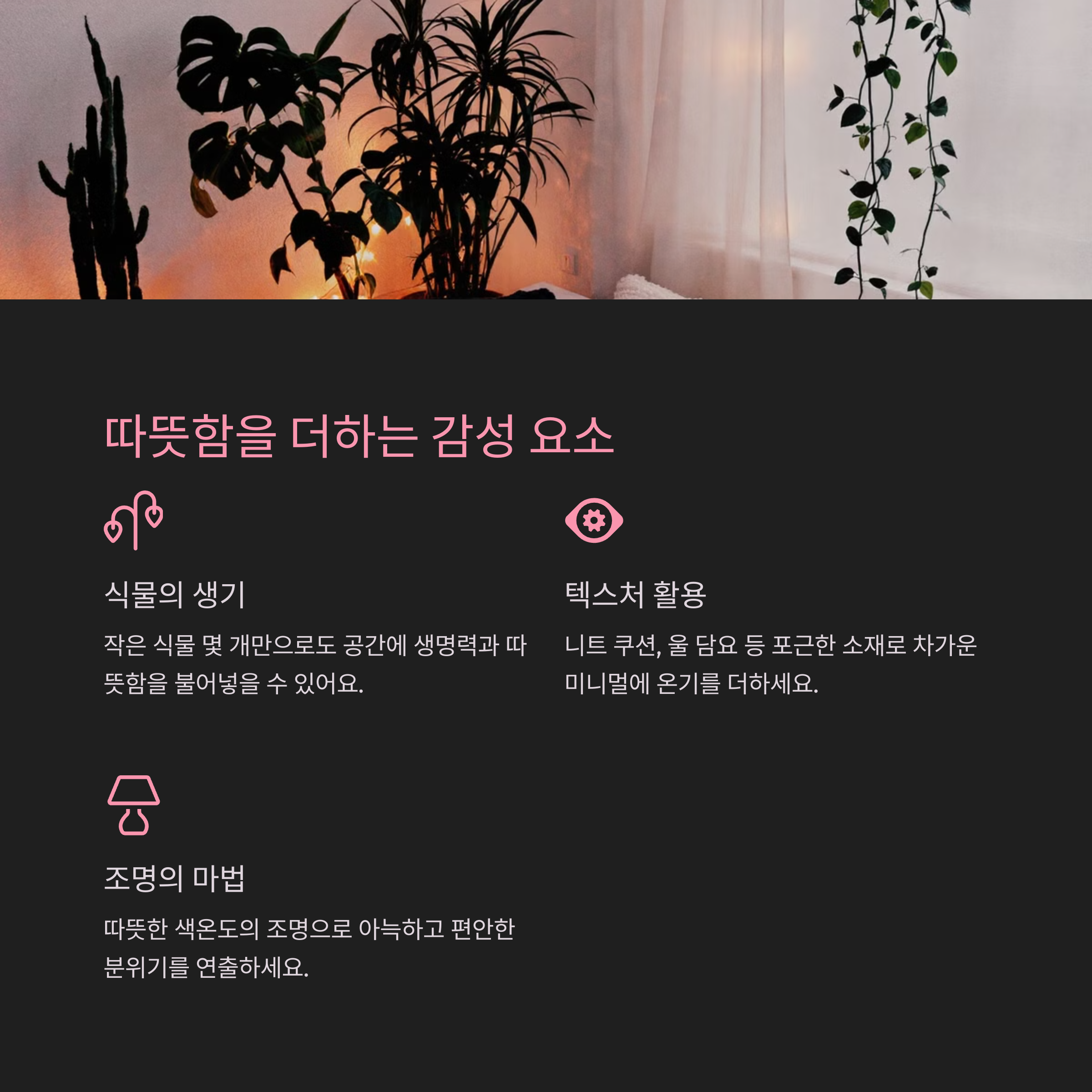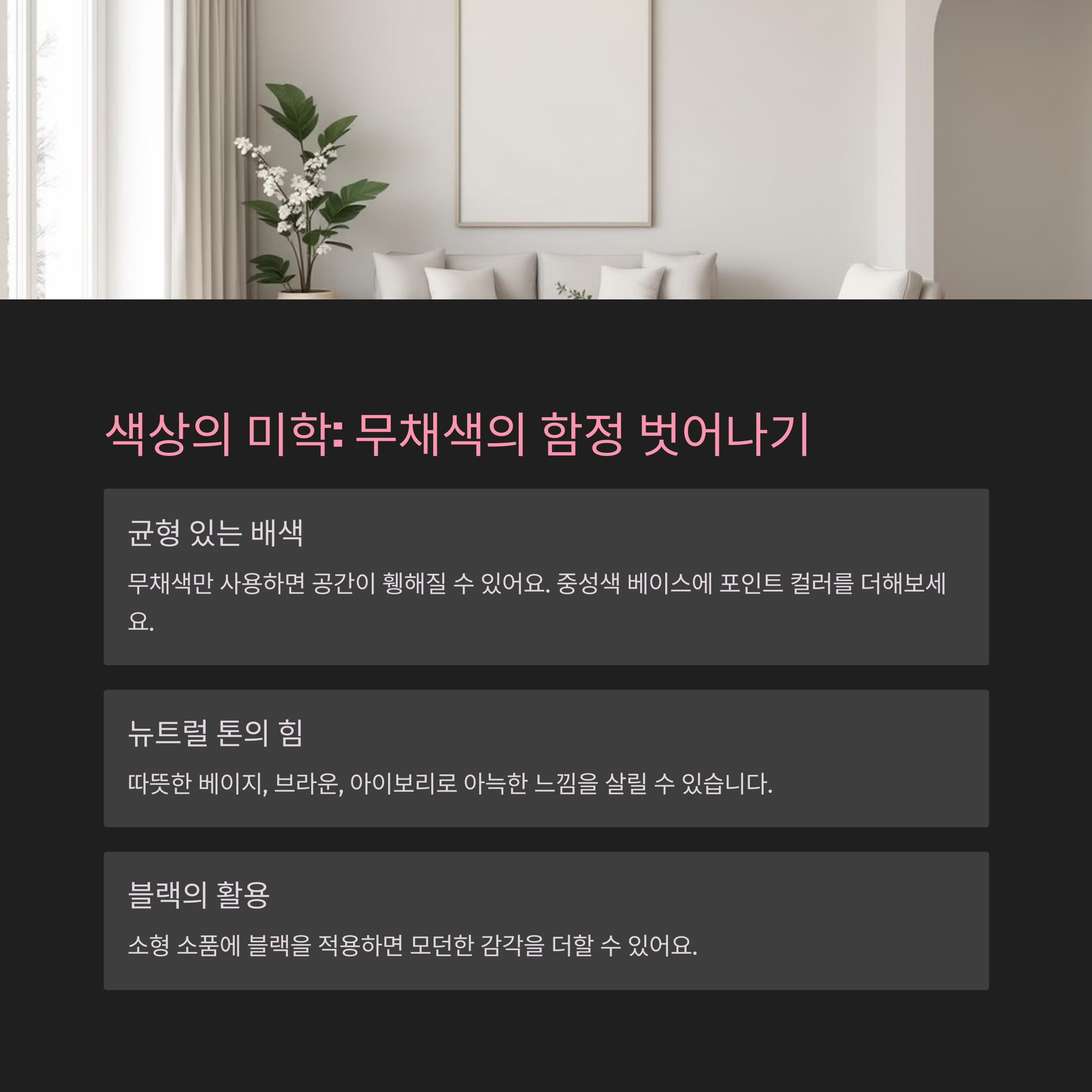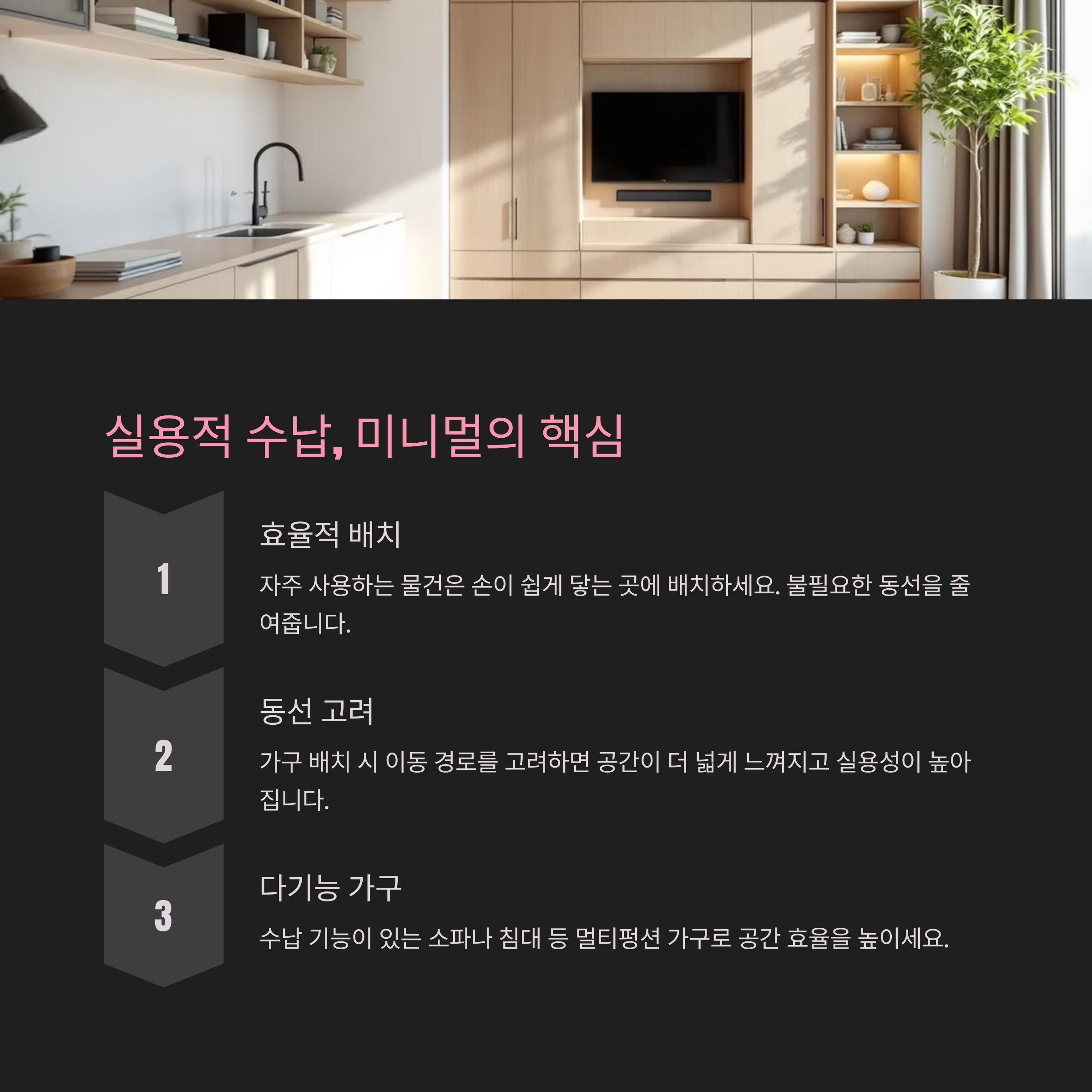 | 덜어내되 ‘나답게’ 남기는 것도 중요해요 | 무채색만 고집하면 공간이 밋밋해져요 | 수납을 숨기지 말고, 흐름을 고려해 구성해요 |
