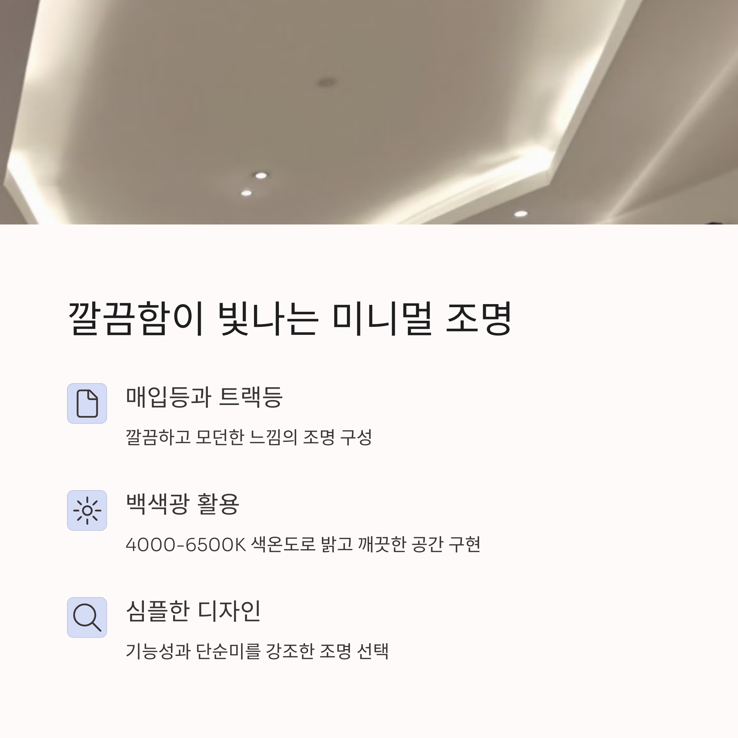 | 따뜻한 전구색과 다양한 간접조명 활용 | 매입등, 라인 조명으로 깔끔함 강조 | 용도별 조명 밝기와 색상 조합 중요 |