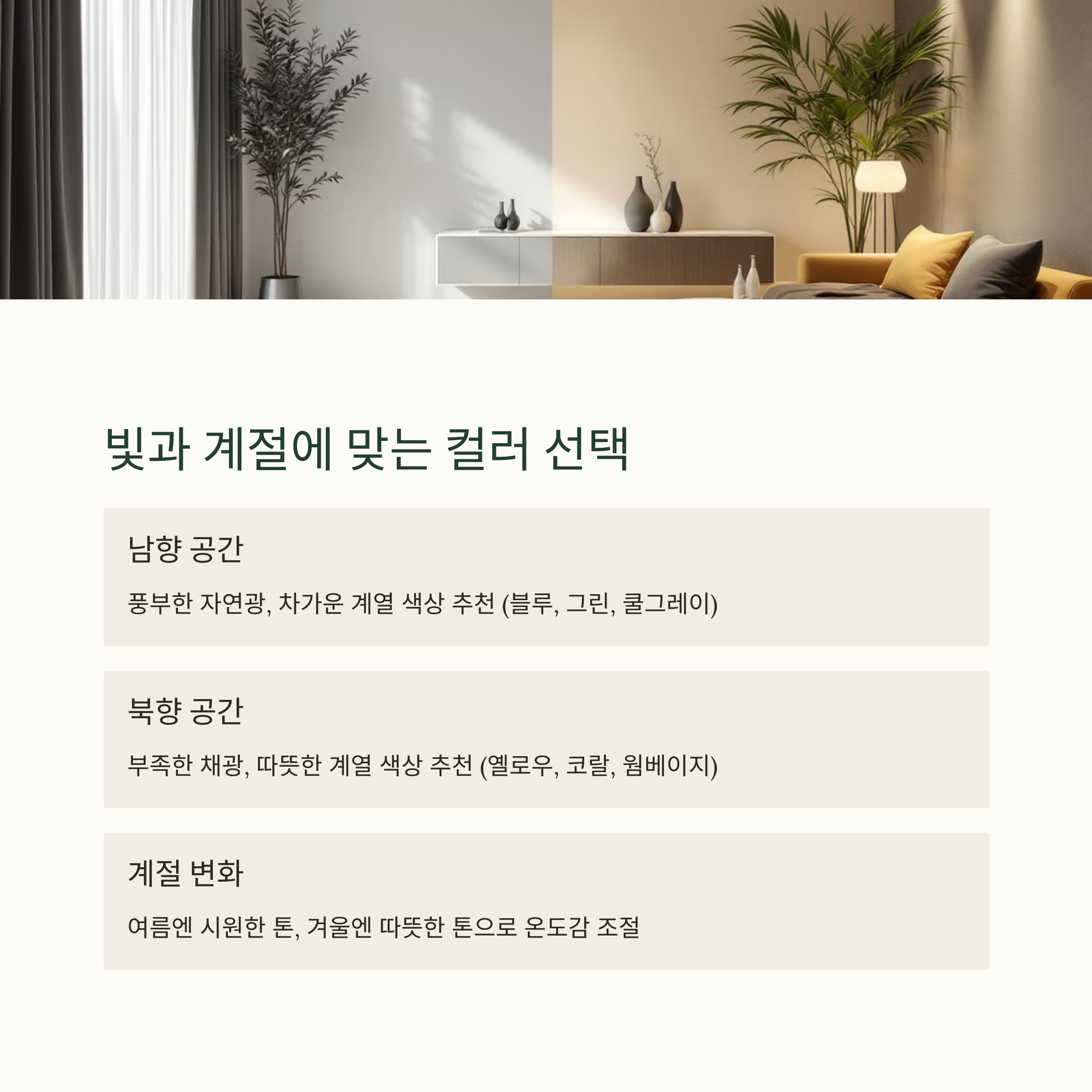 | 가구나 커튼의 색조화도 중요합니다. | 화이트+그레이, 베이지+브라운 조합이 인기입니다. | 낮은 채광에는 밝은 색, 강한 빛에는 중간톤이 적절합니다. |