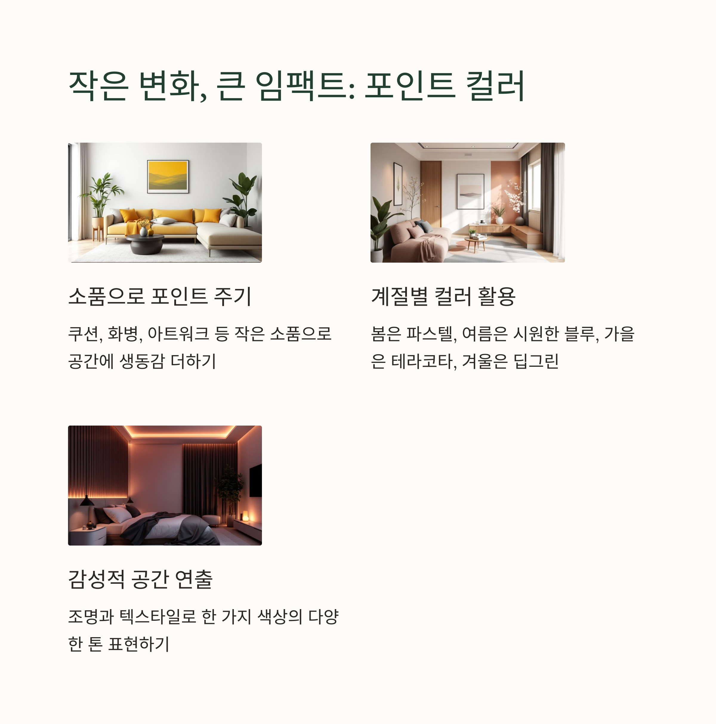 색감 하나만으로 공간을 변화시키고 싶다면 계절감과 채광을 함께 고려해야 합니다. 예를 들어 햇살이 잘 드는 거실에는 따뜻한 톤의 옐로우나 코랄 계열이 생기를 더해주며, 북향 방처럼 어두운 공간에는 밝은 베이지나 아이보리 컬러가 답답함을 줄이고 개방감을 느끼게 해줍니다.
