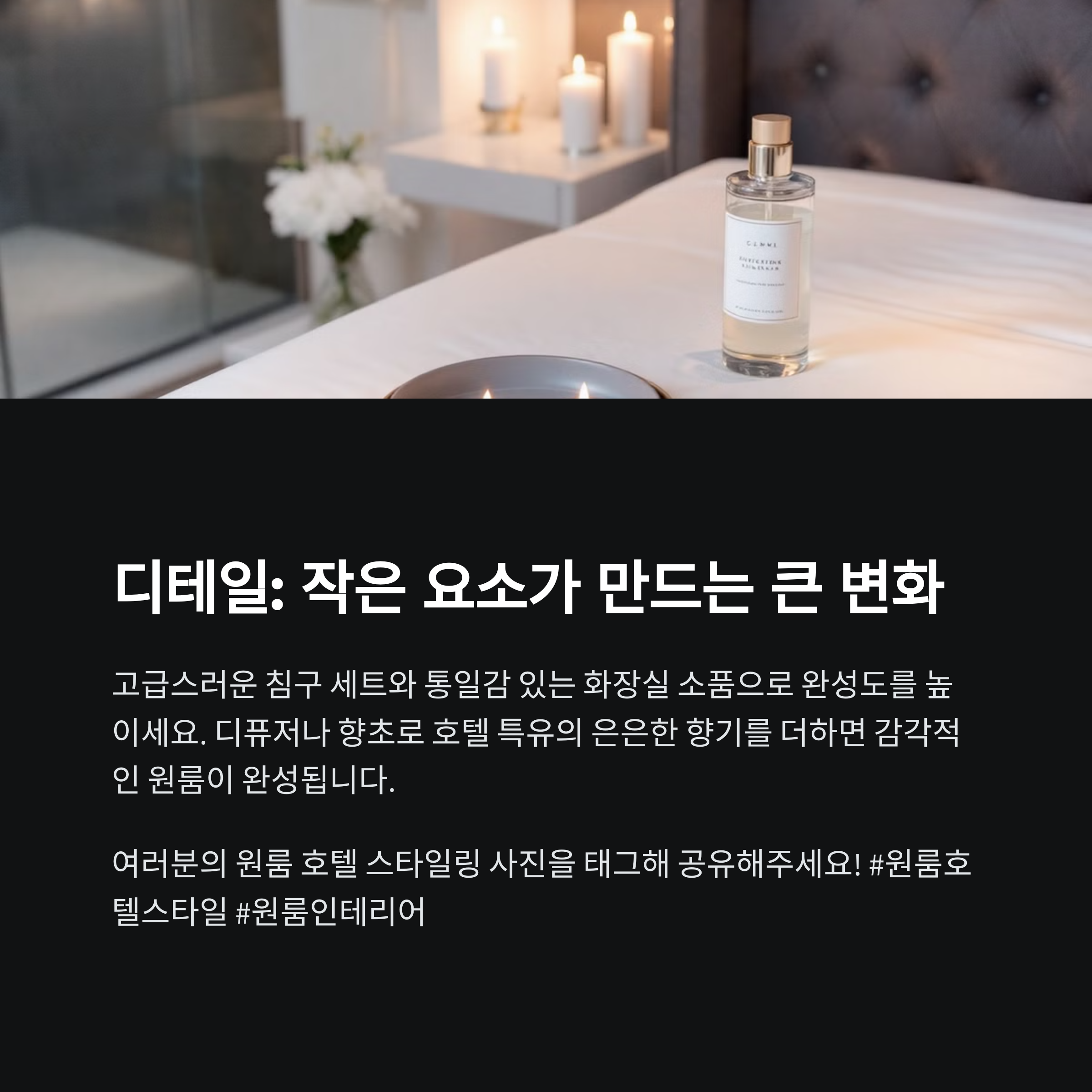 원룸이라도 충분히 고급스럽고 따뜻한 공간이 될 수 있어요. 핵심은 빛, 색, 소재의 조화. 비싸지 않아도 디테일에 신경 쓰면 나만의 호텔 룸 같은 공간이 완성됩니다. 오늘 소개한 팁으로 내 방의 분위기를 바꿔보세요!
