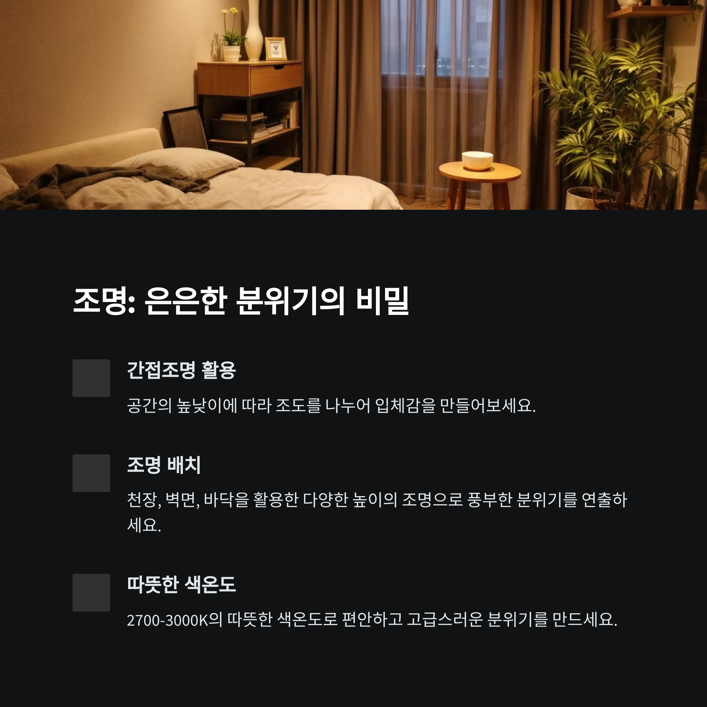 | 무드등, 스탠드, 간접등으로 조도 조절 | 밝기와 채도가 유사한 색상으로 조화 | 커튼, 러그, 벽 장식으로 구역 나누기 |