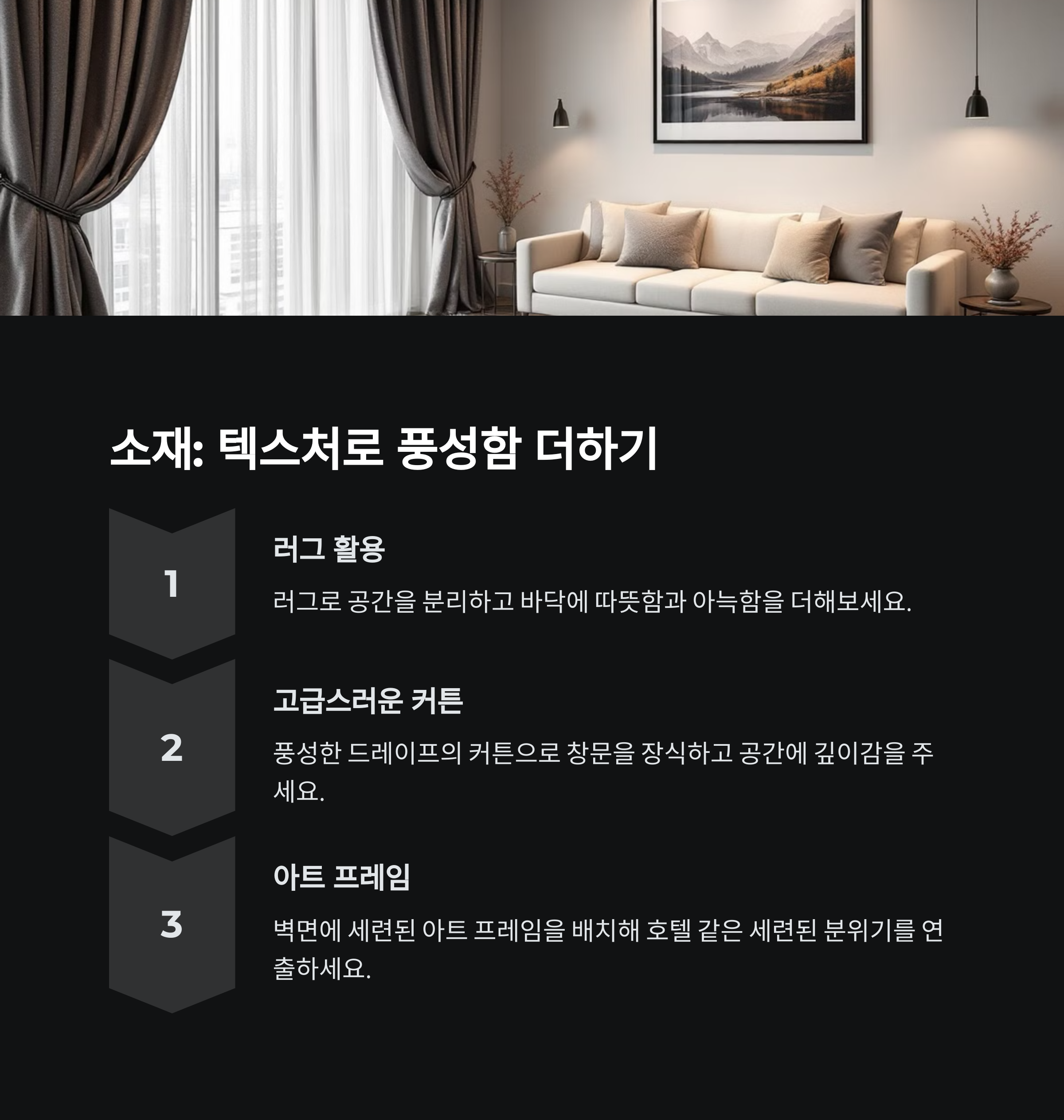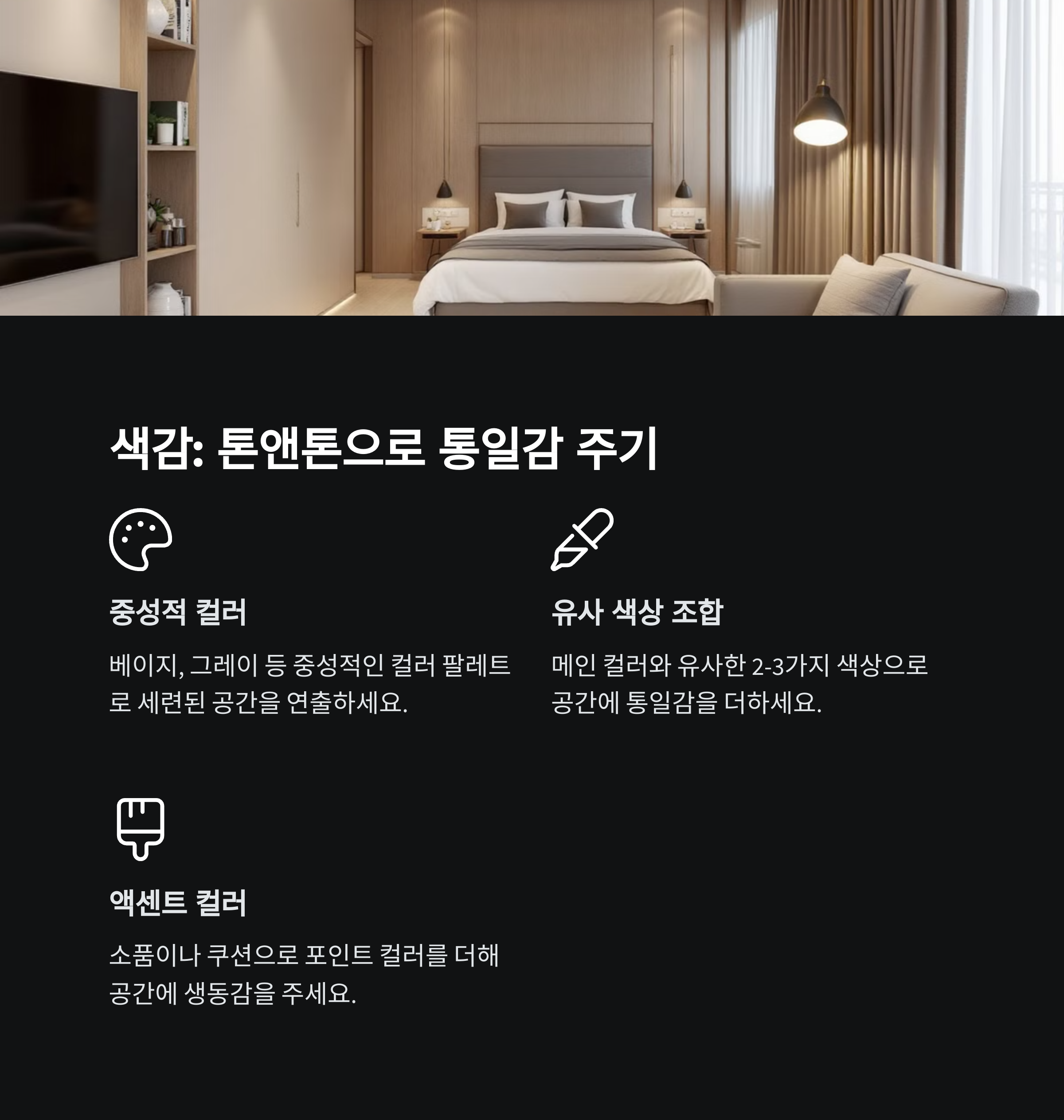 | 고급 인테리어 핵심 | 조명, 톤앤톤 컬러, 소재 질감의 통일이 핵심이에요 |