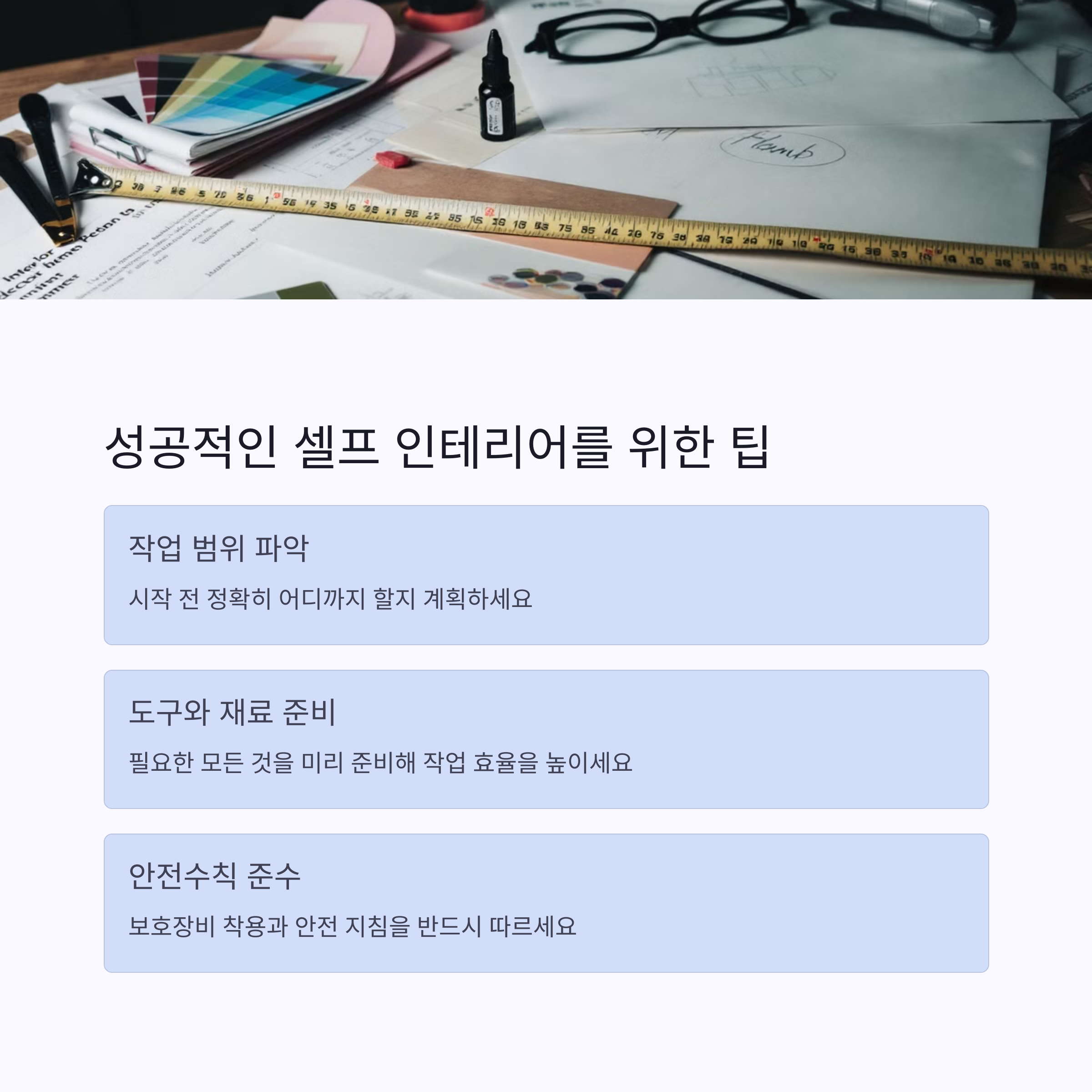 자가 인테리어는 비용을 줄이고 만족감을 높일 수 있는 좋은 방법입니다. 하지만 시공 범위와 위험도를 정확히 파악하는 것이 중요합니다. 스스로 할 수 있는 작업은 충분히 도전하되, 전문성이 필요한 영역은 전문가에게 맡기는 것이 진짜 스마트한 셀프 인테리어입니다.
