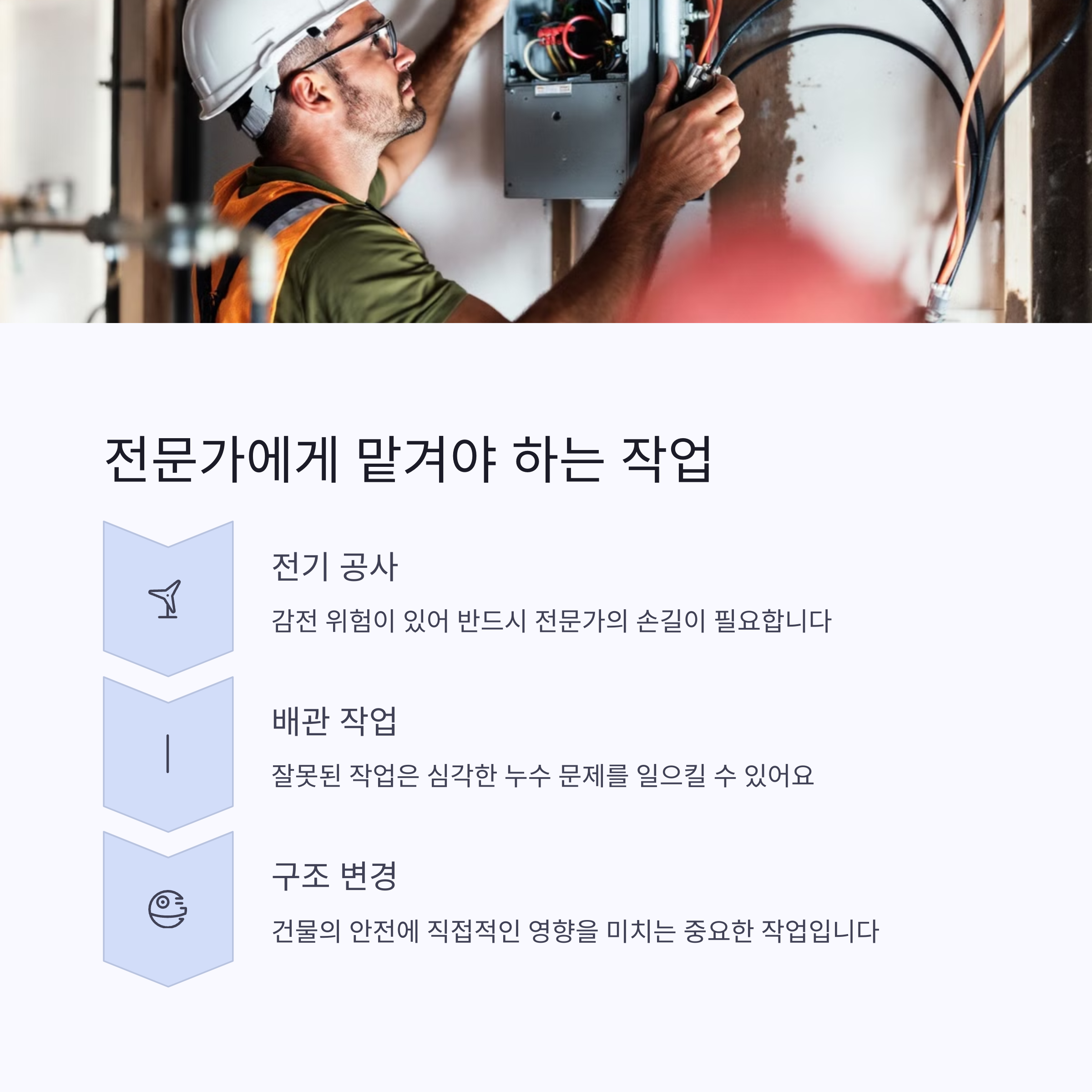 반면, 전기 배선, 수도 배관, 구조물 철거는 법적 규정과 안전 문제로 반드시 전문가가 시공해야 합니다. 특히 콘센트 추가, 보일러 위치 변경 등은 허가가 필요한 작업일 수 있으며, 잘못 시공 시 화재나 누수 사고로 이어질 수 있습니다. 내가 할 수 있는 작업인지 확실히 구분하는 것이 중요합니다.