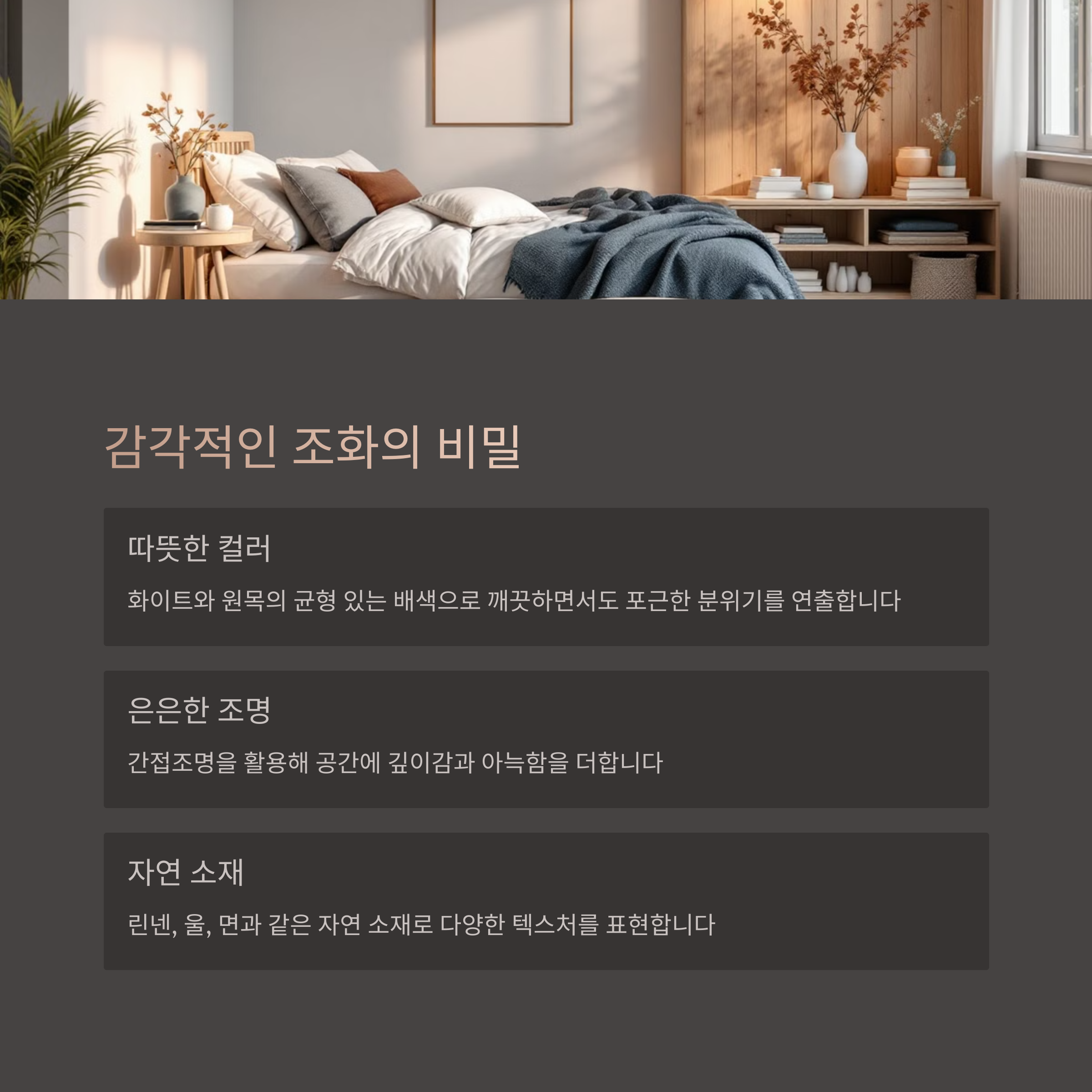 | 감성 마감 | 컬러, 소재, 조명을 활용한 감성 연출 마무리 |