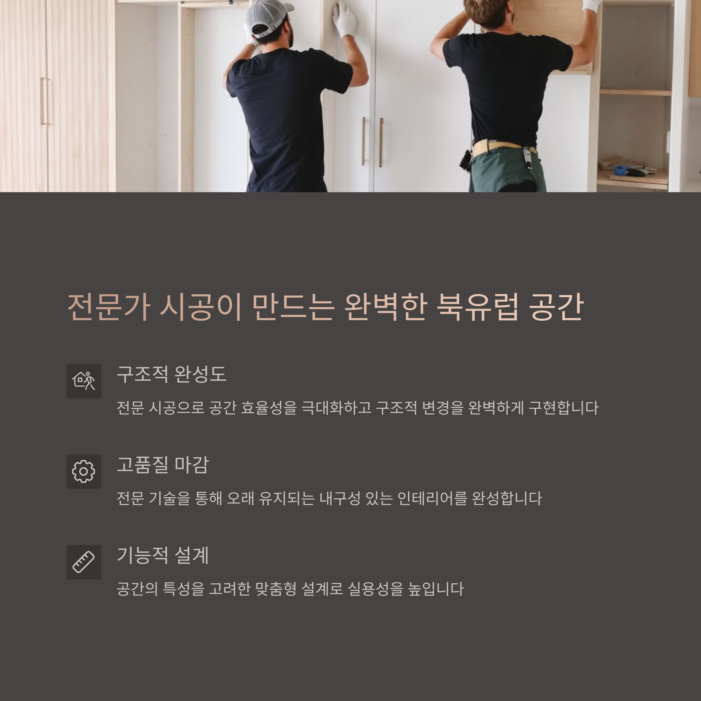| 구조 시공 | 북유럽 스타일에 맞는 공간 동선과 구조 정리 |