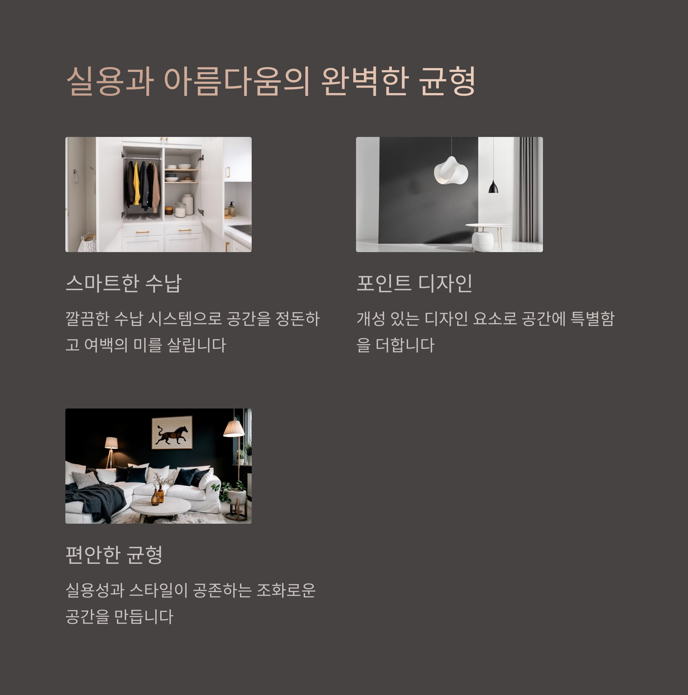 | 실용성과 여백의 미가 공존하는 공간 설계 | 설비, 마감, 조도까지 맞춘 균형 있는 시공 | 셀프로 구현하기 어려운 정교한 완성도 확보 |