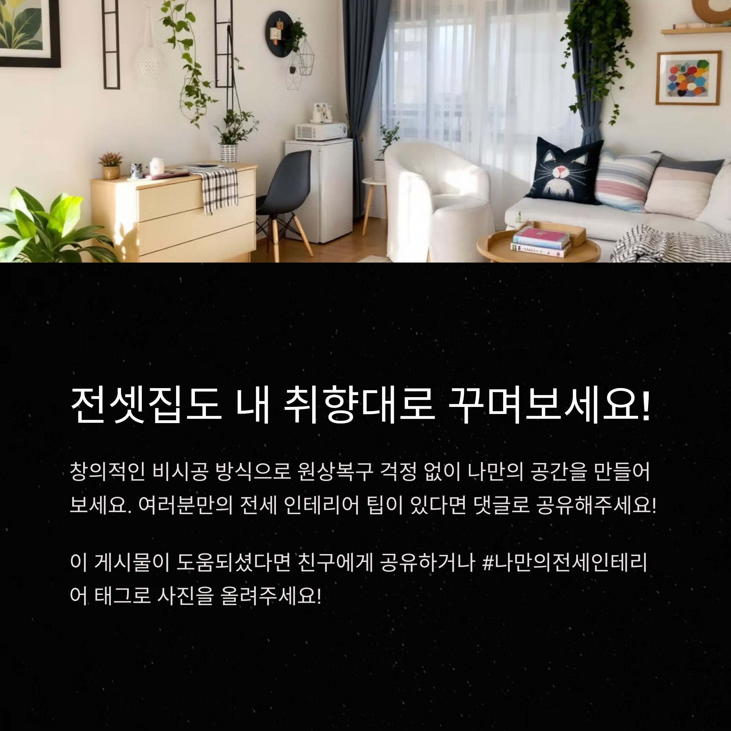 전세집에서도 감성 있게 꾸며본 경험, 실패했던 인테리어 사례, 꼭 피해야 할 실수 등 여러분의 이야기를 댓글로 함께 나눠주세요!