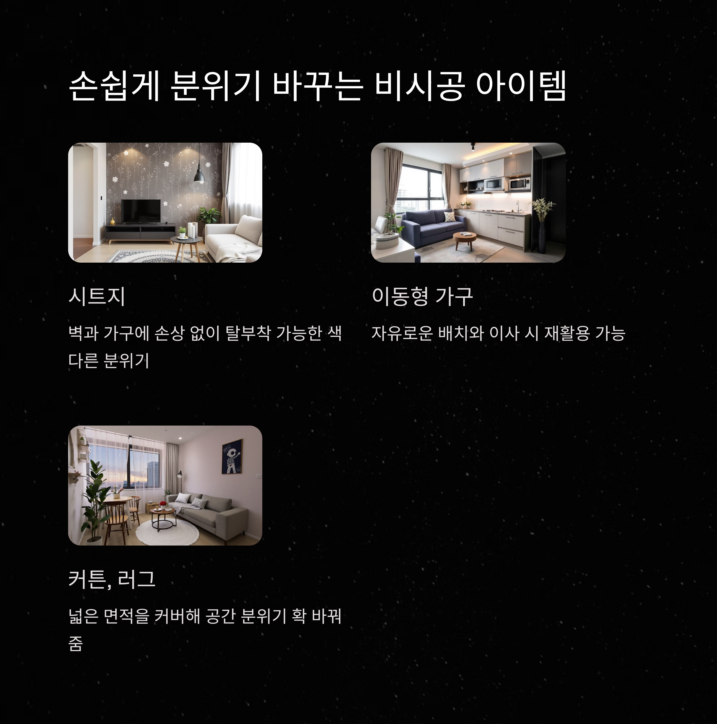 | 계약 조건 확인과 집주인 동의 필수 | 시트지, 커튼, 이동형 가구 활용 | 철거 쉬운 방식으로 인테리어 구성 |
