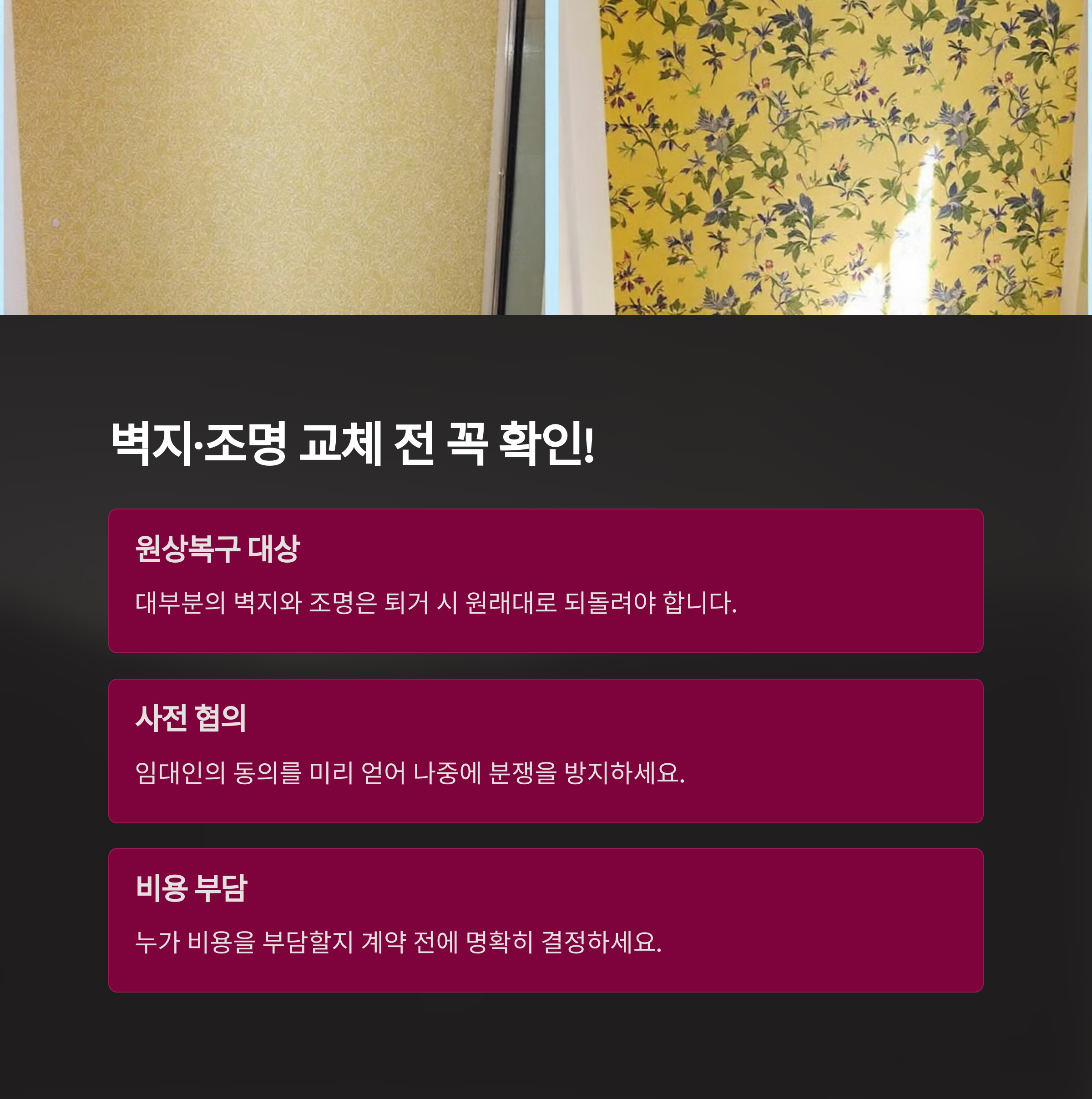 전세 인테리어를 계획할 때는 작업 범위를 구체적으로 정리하고 임대인의 동의 여부를 확인한 뒤 변경 사항을 계약서나 메시지로 기록해두는 것이 안전합니다. 단순한 벽지 교체도 문제가 될 수 있기 때문에 가능한 경우 임대인의 서면 동의서를 받는 것이 보증금 보호에 유리합니다. 인테리어보다 분쟁 예방이 더 중요하다는 점을 잊지 말아야 합니다.