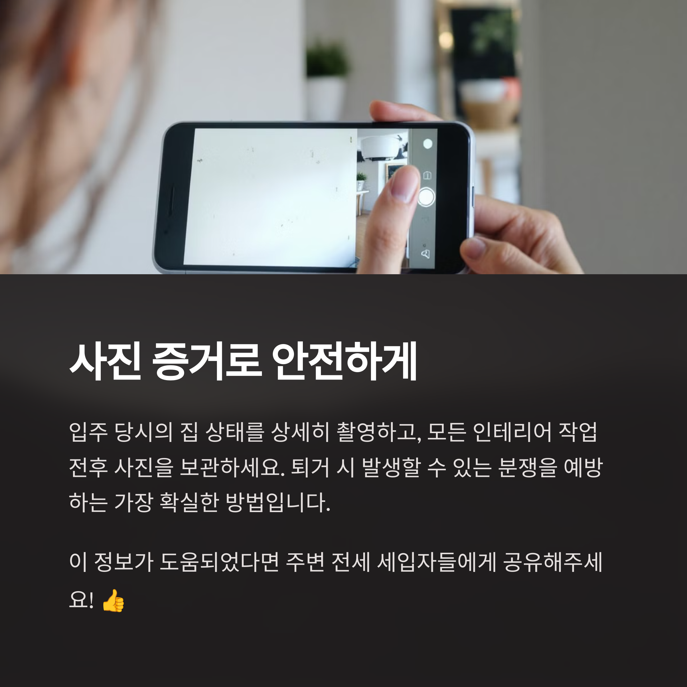 전세 인테리어는 내 공간을 아름답게 꾸미는 것도 중요하지만 무엇보다 보증금과 계약 안정성을 지키는 일이 선행되어야 합니다. 작은 변화라도 사전에 임대인과 확실히 협의하고 사진과 문서로 기록해 두는 습관이 중요합니다. 아름다운 공간에서의 삶을 꿈꾸는 만큼, 분쟁 없는 현명한 선택으로 그 꿈을 지켜가시길 바랍니다.