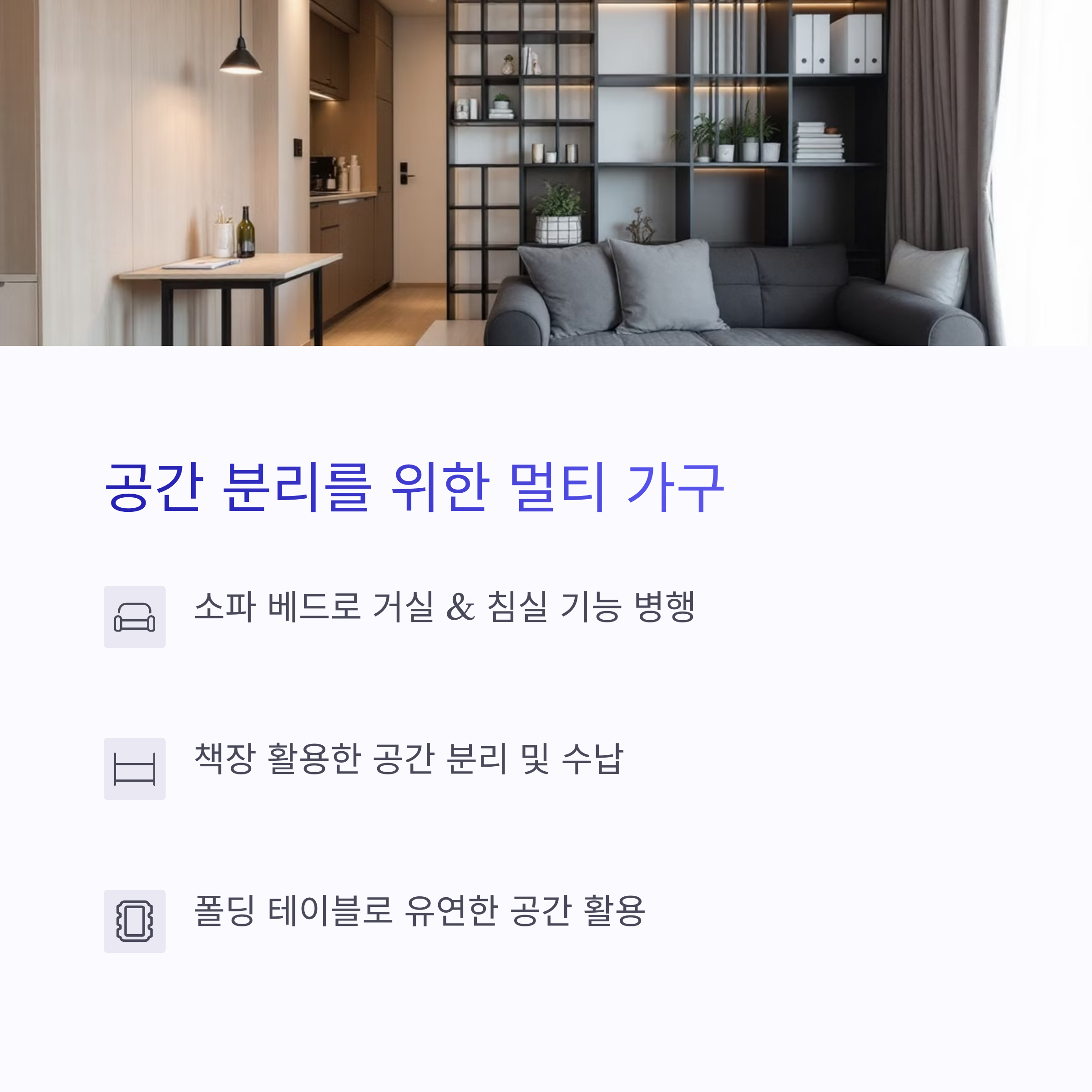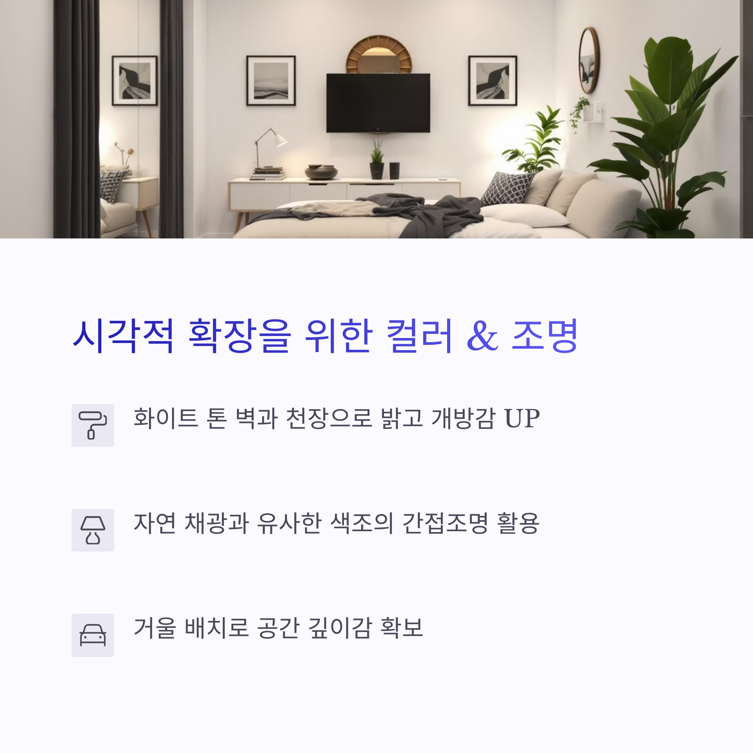 | 정리만 잘해도 공간 활용도 상승 | 조명으로 천장 높이감 연출 | 작은 집일수록 가구는 가벼워야 함 |